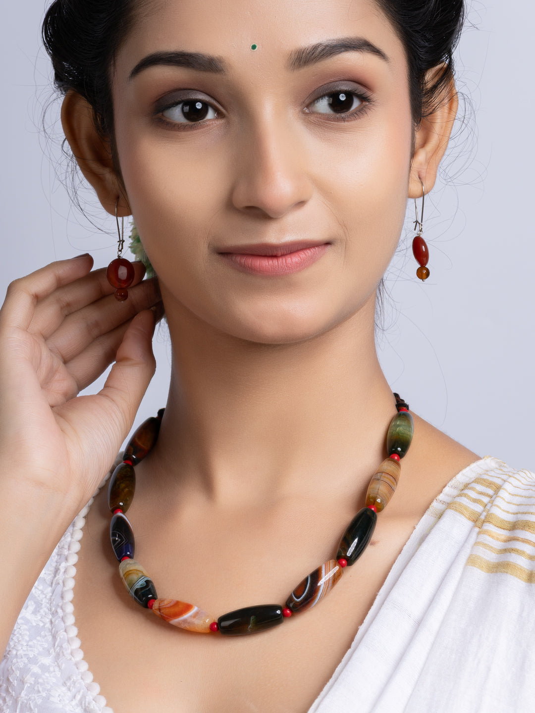 The set includes matching earrings. Both items blend traditional design with modern flair. The semi precious stones necklace is suitable for wedding, events, parties, or casual wear. You get versatility and standout style in one package. The design ensures comfort all day long. The secure clasp keeps the necklace in place.