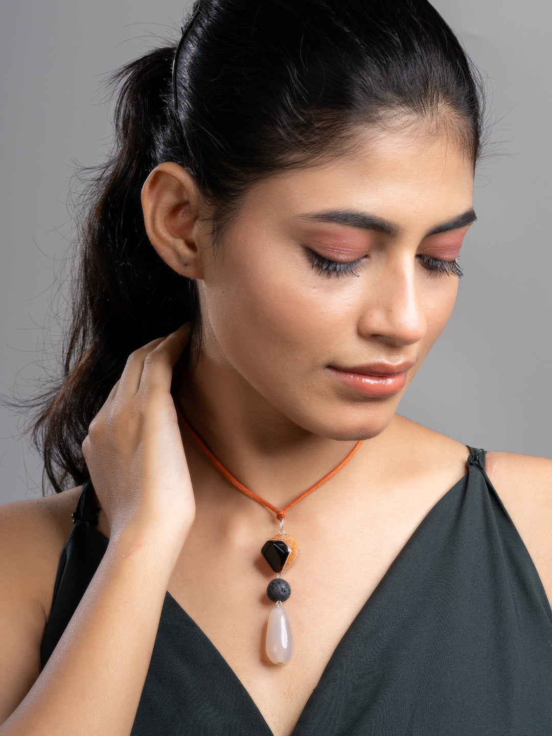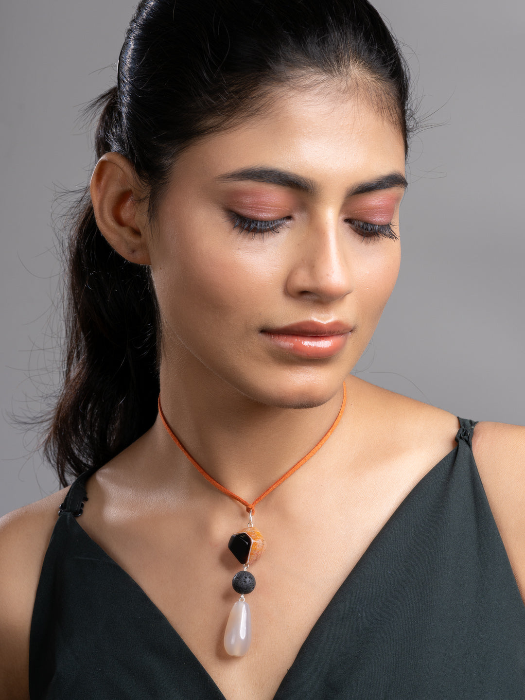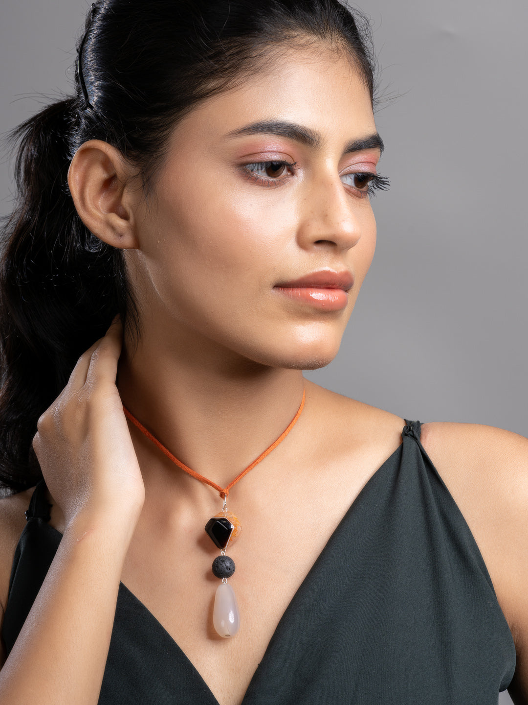 Brown Black Onyx Agate Lava Sleek Necklace With Adjustable Suede Cord