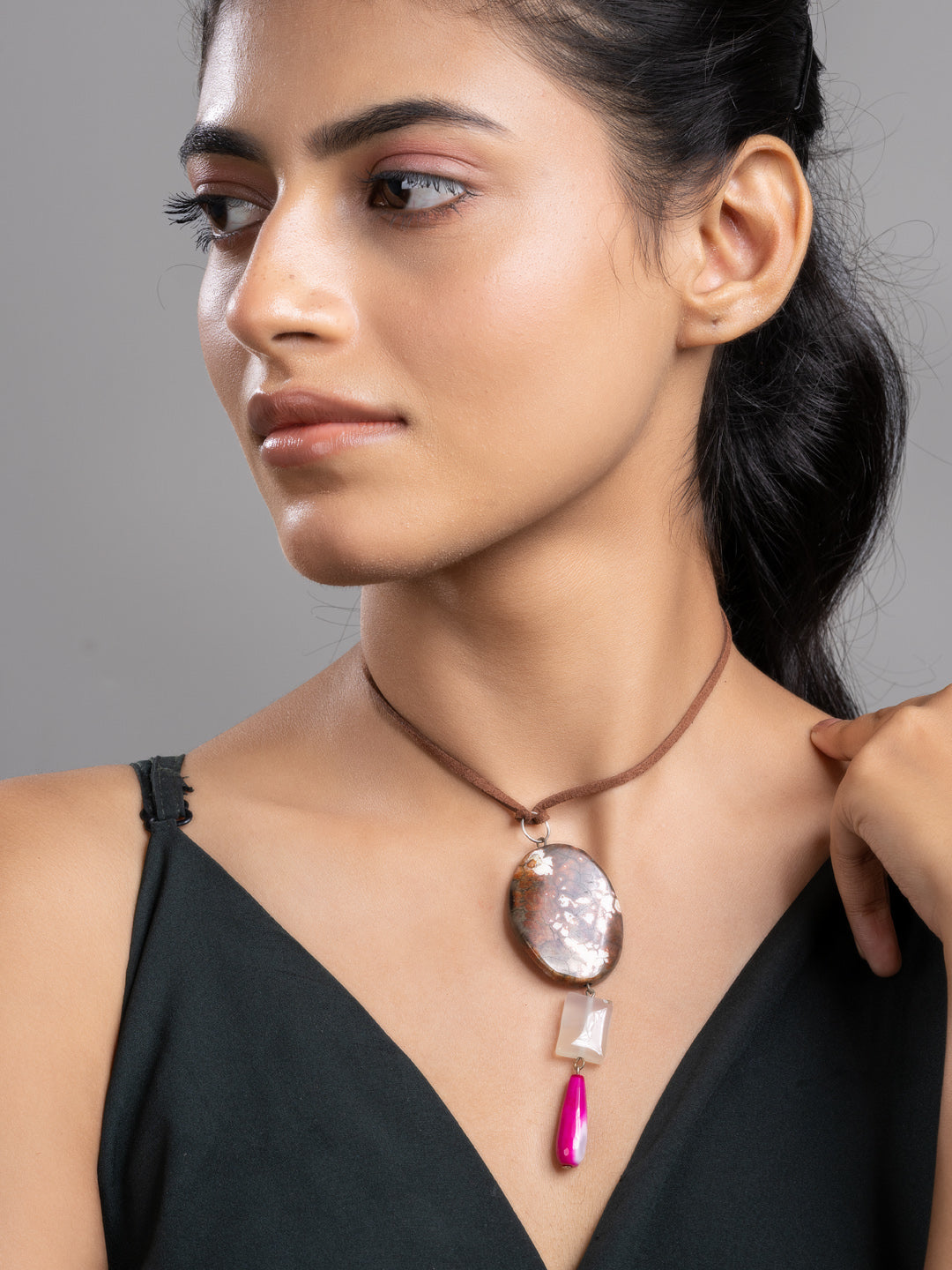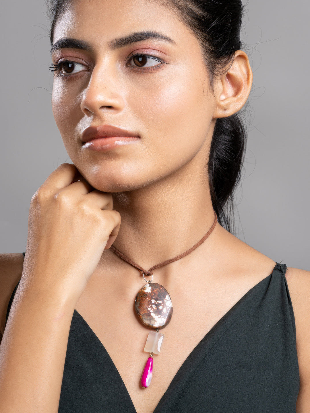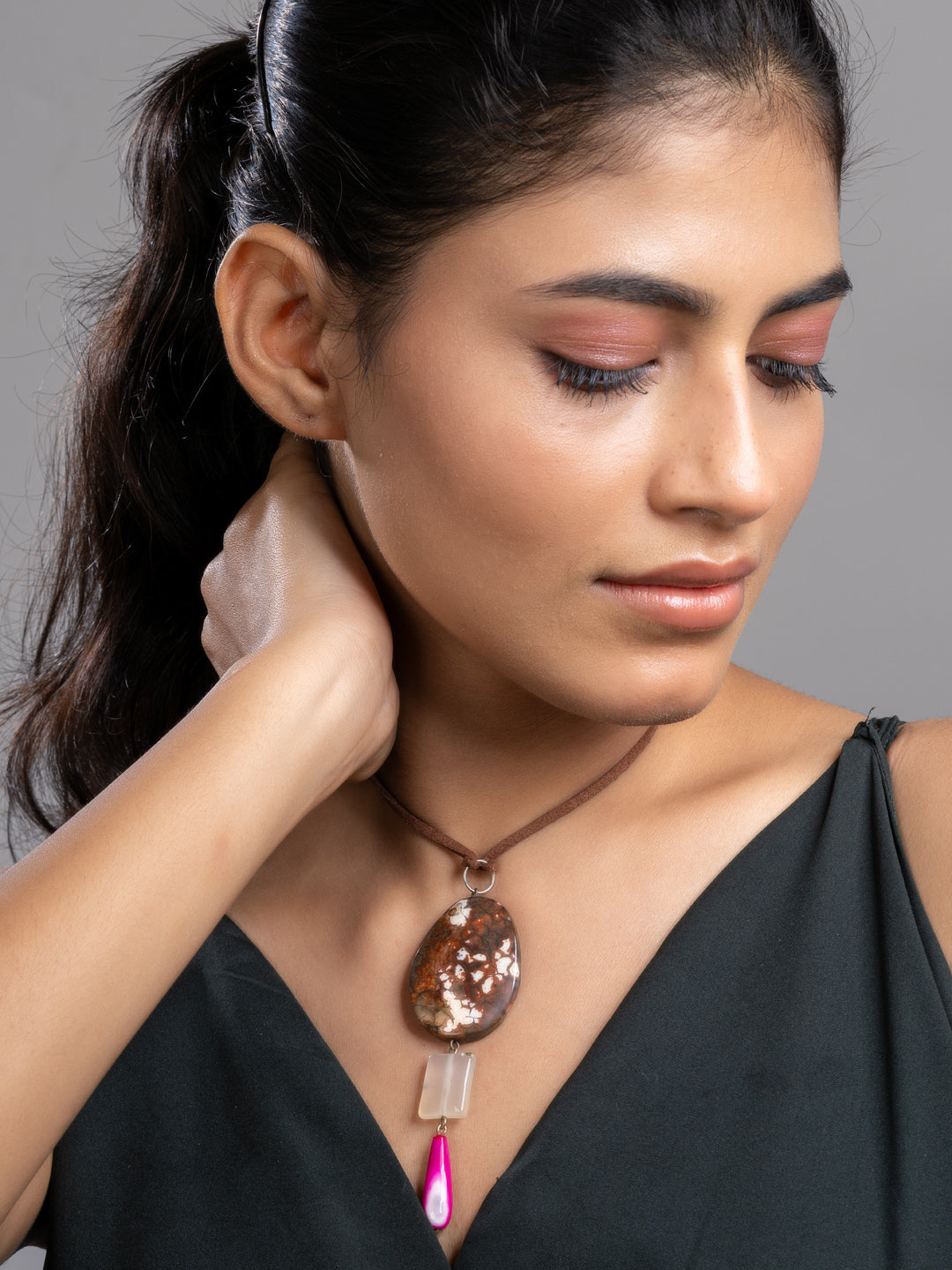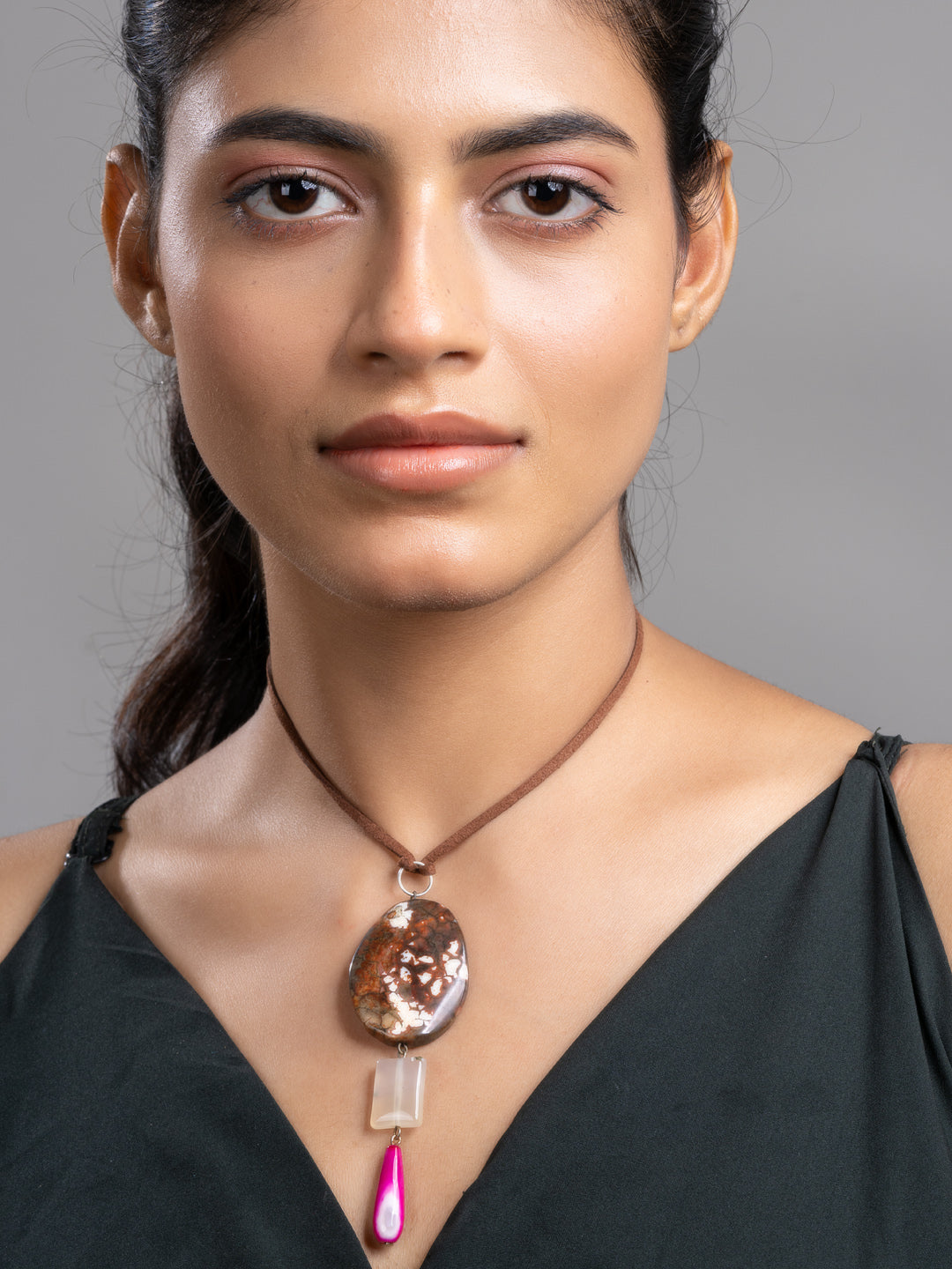 Pink Brown Onyx Agate Sleek Necklace With Adjustable Suede Cord