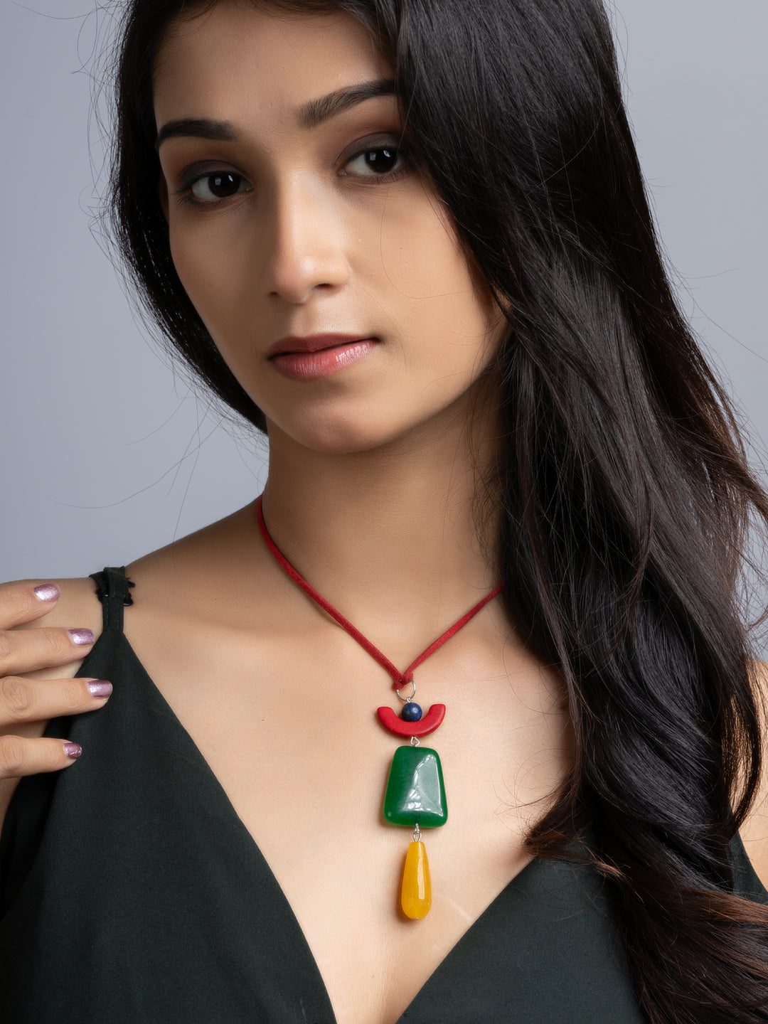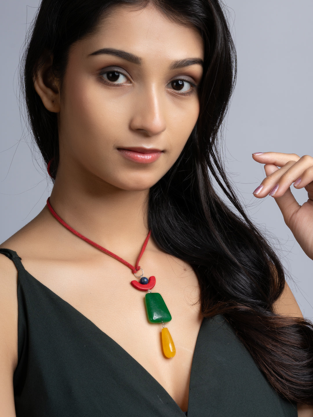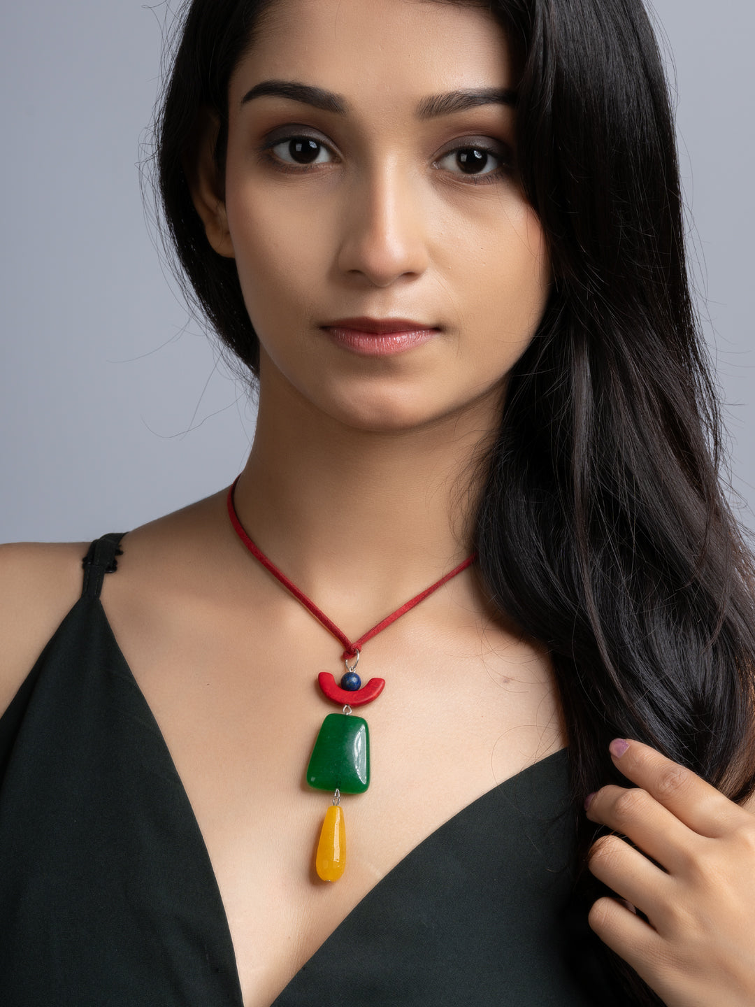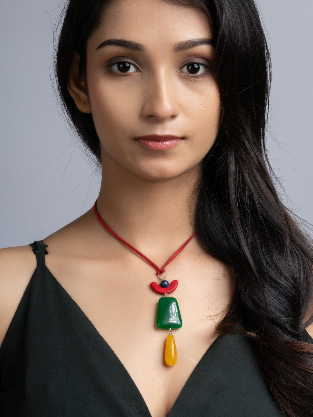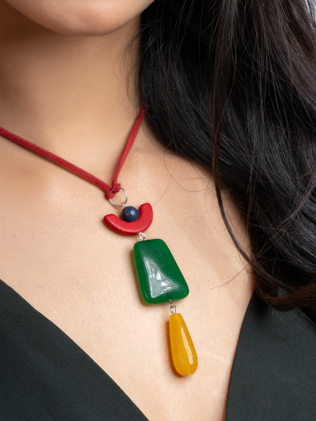 Red Yellow Green Blue Onyx Agate Sleek Necklace With Adjustable Suede Cord
