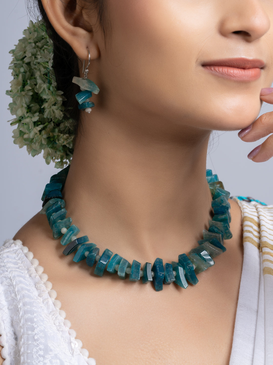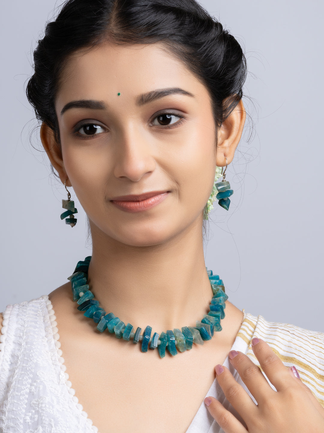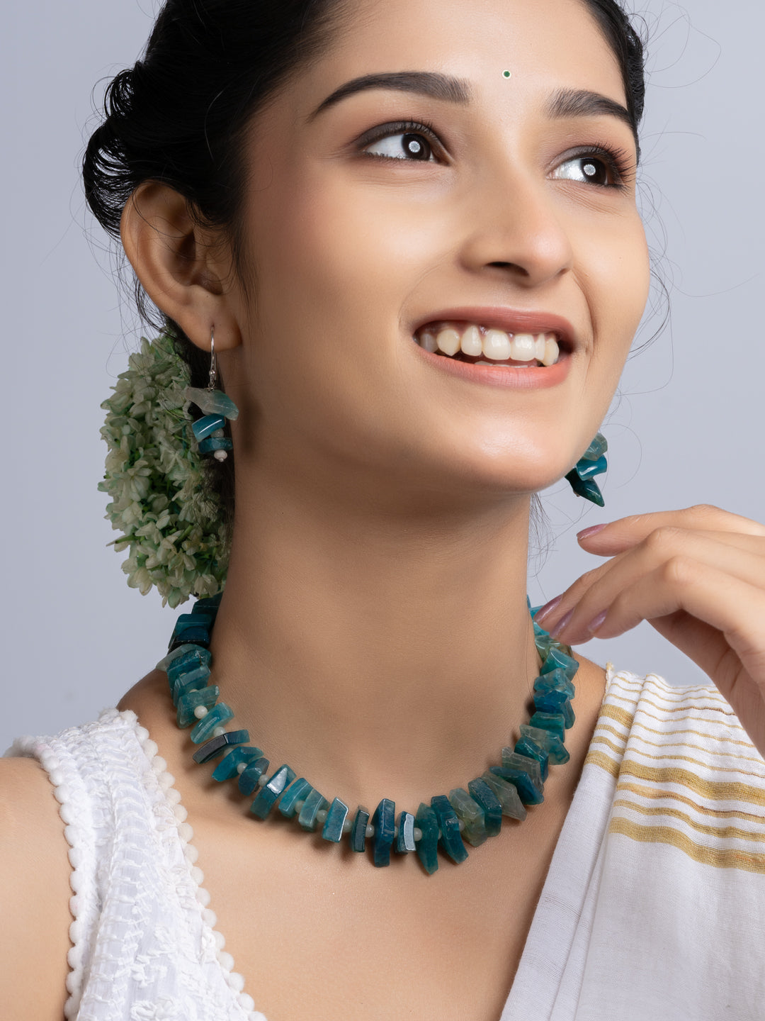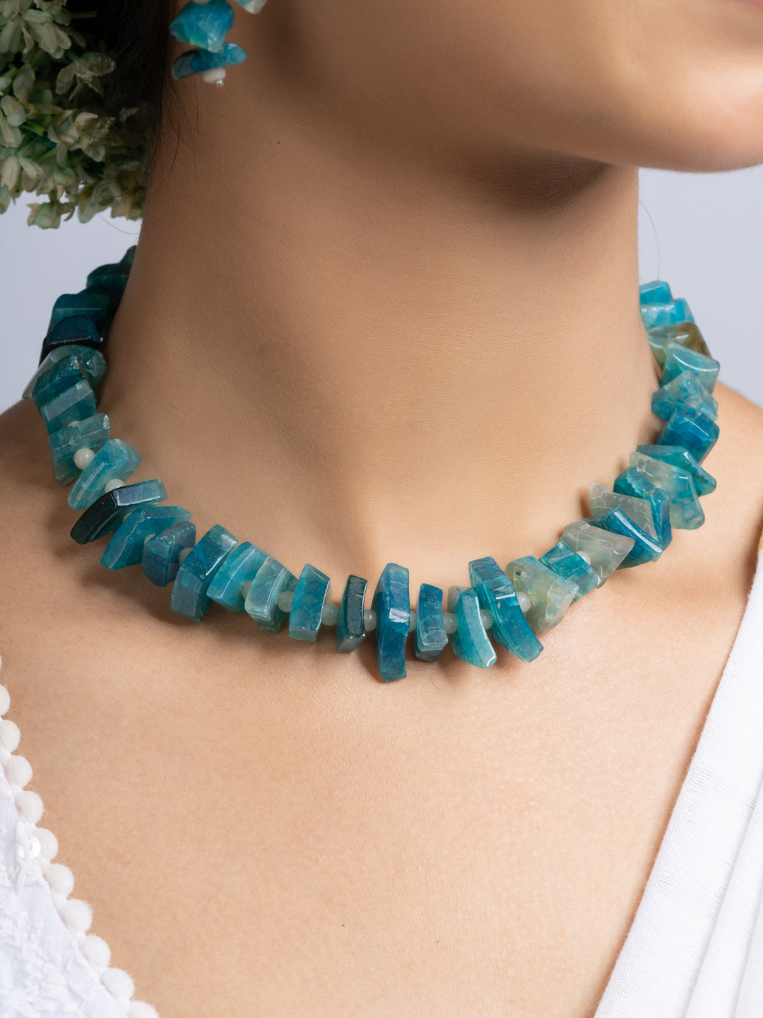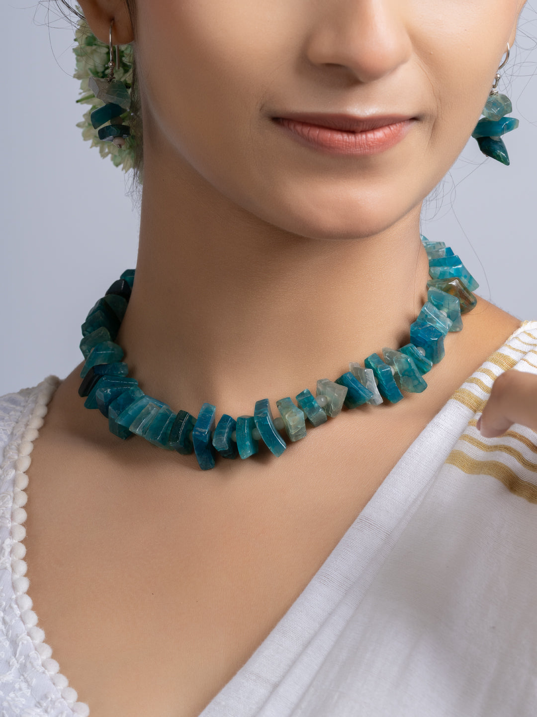 The set includes matching earrings. Both items blend traditional design with modern flair. The semi precious stones necklace is suitable for wedding, events, parties, or casual wear. You get versatility and standout style in one package. The design ensures comfort all day long. The secure clasp keeps the necklace in place.