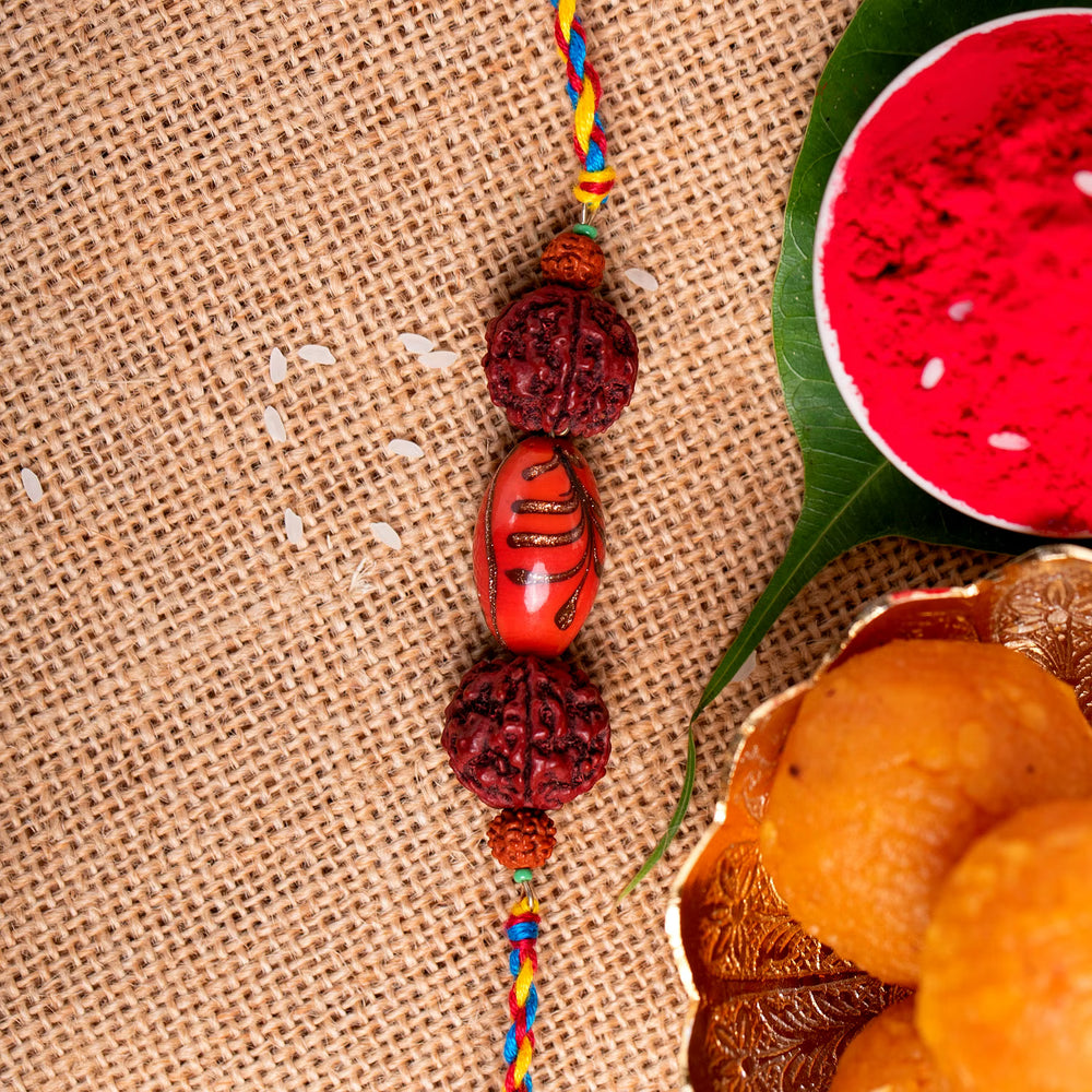 Add Handmade Designer Triplet Rudraksh Rakhi With Roli And Chawal For Raksha Bandhan Celebration to the cart